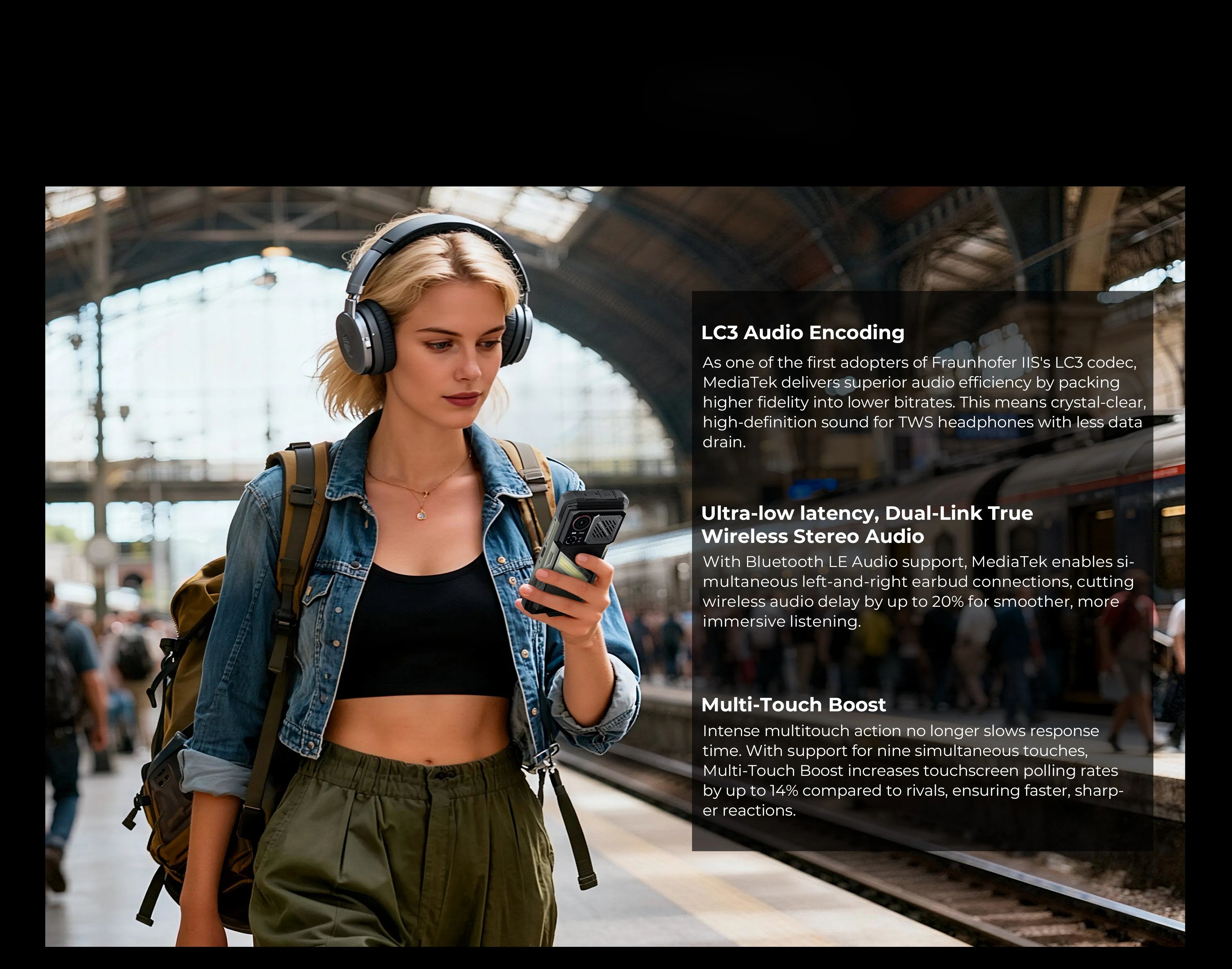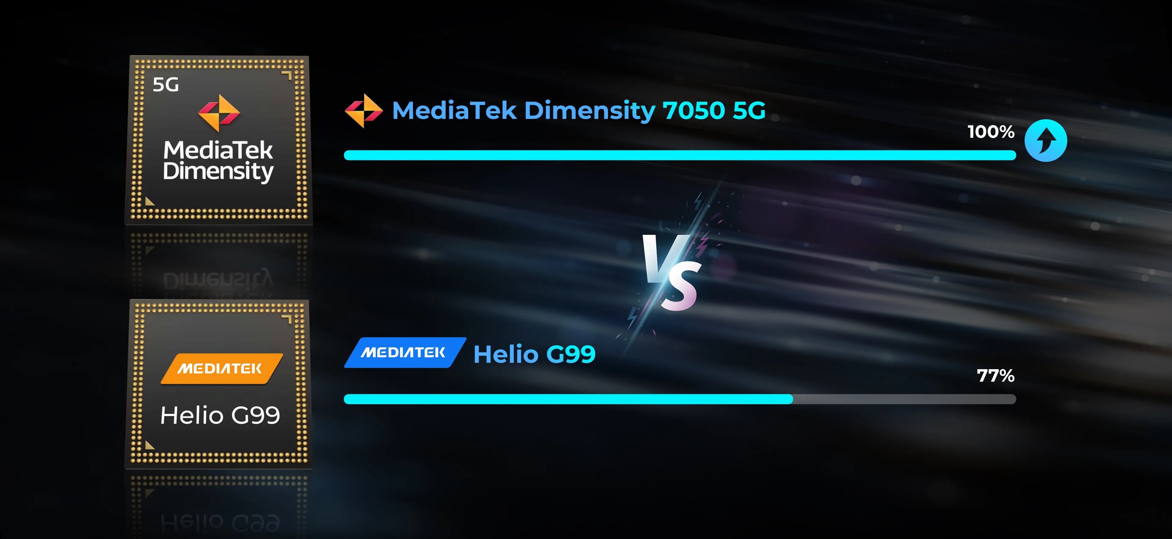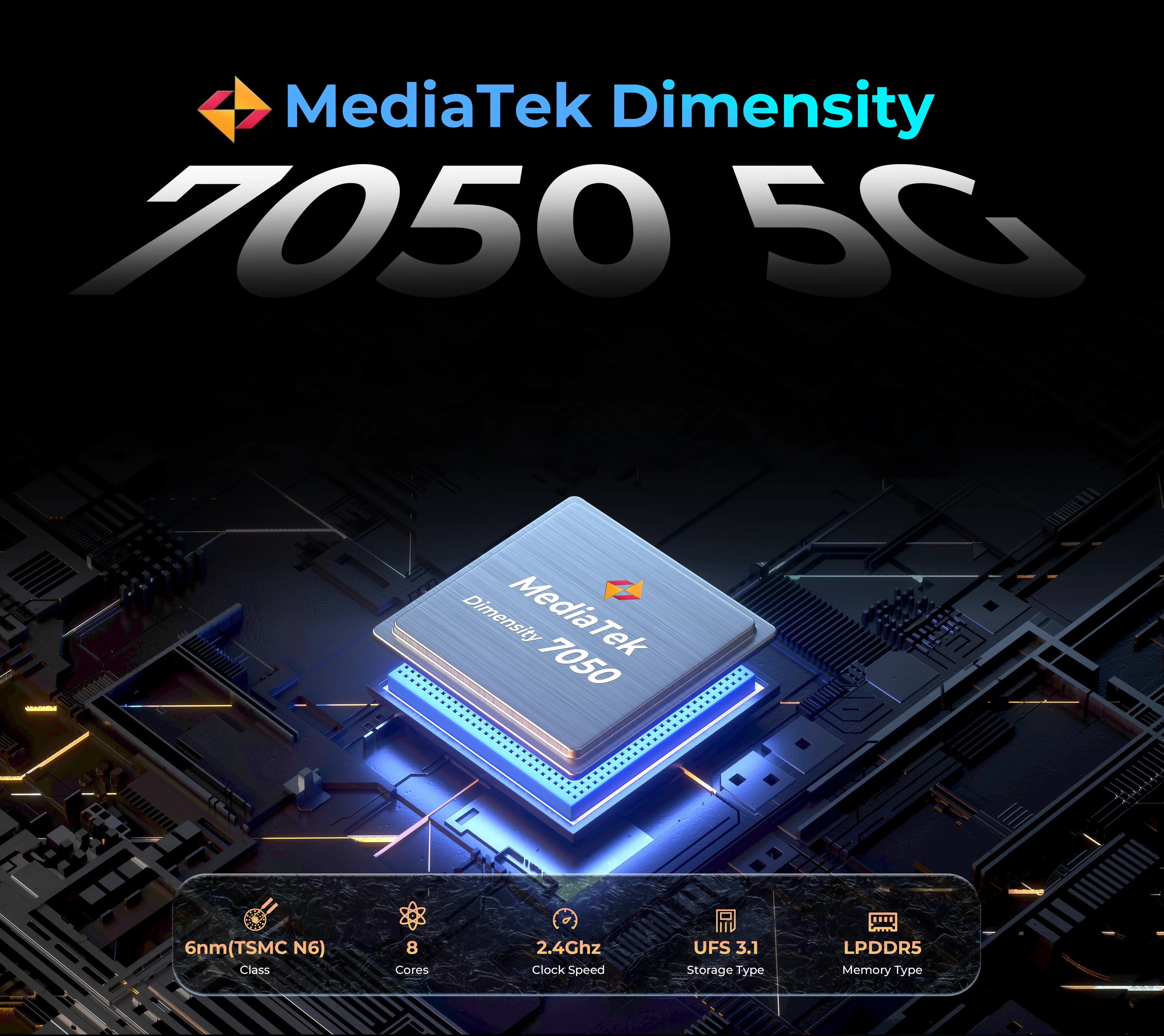 The Dimensity 7050’s integrated 5G modem, built on an advanced 6nm process, is powered by MediaTek 5G UltraSave—a suite of intelligent power-saving technologies that extend performance while conserving battery life.