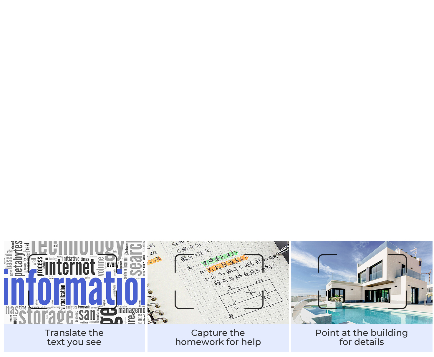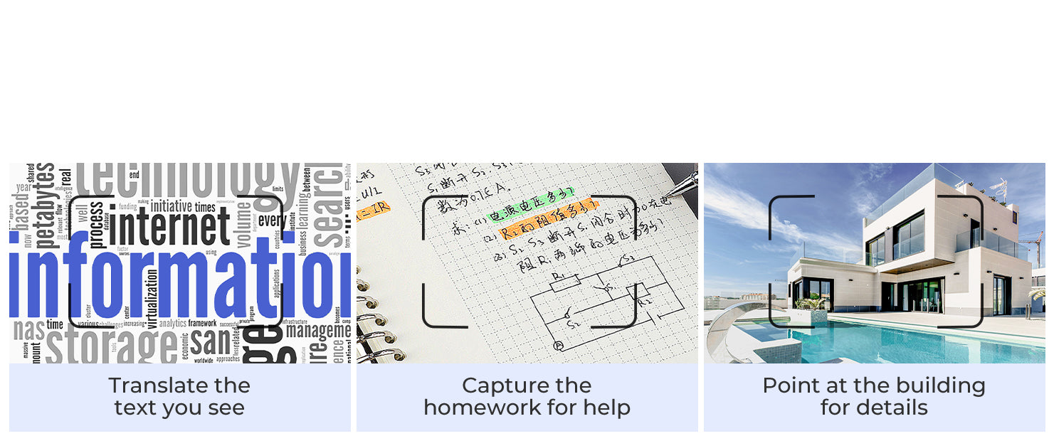 Take advantage of the powerful Google technology to make your life easier. Photo translation, building, product identification, home problems, skin conditions recognition and more.