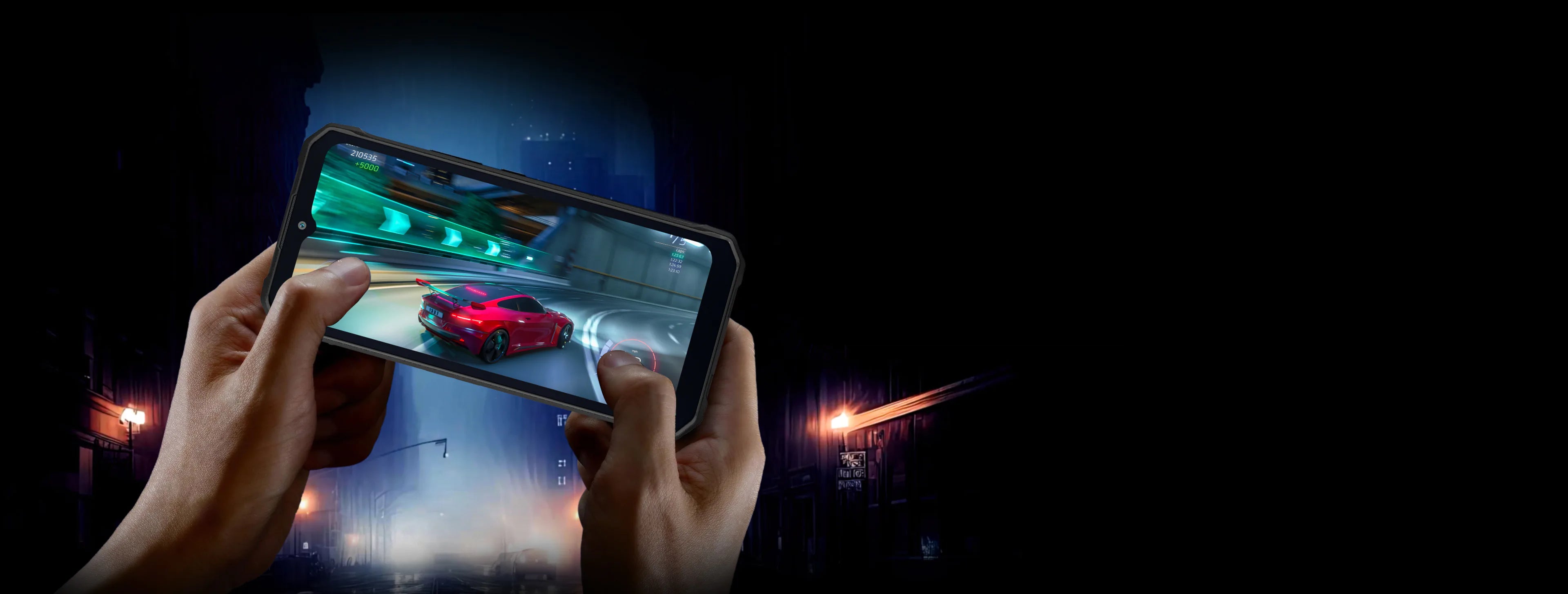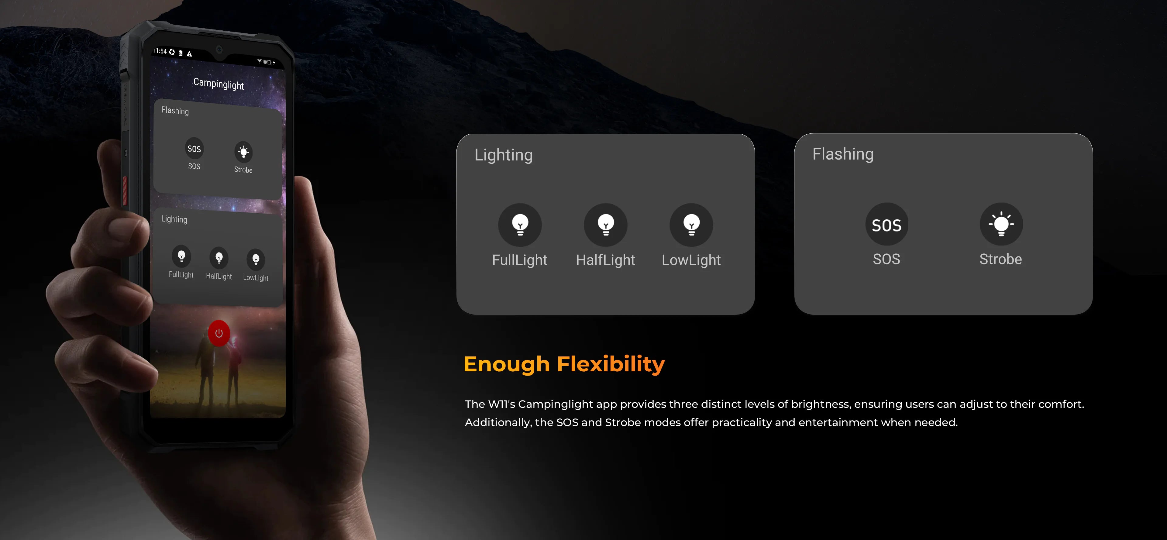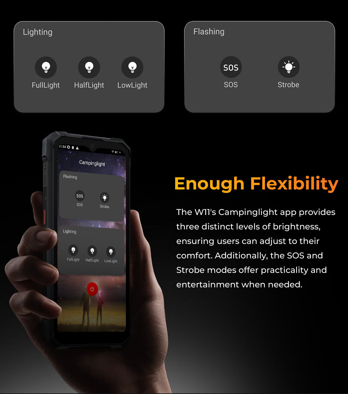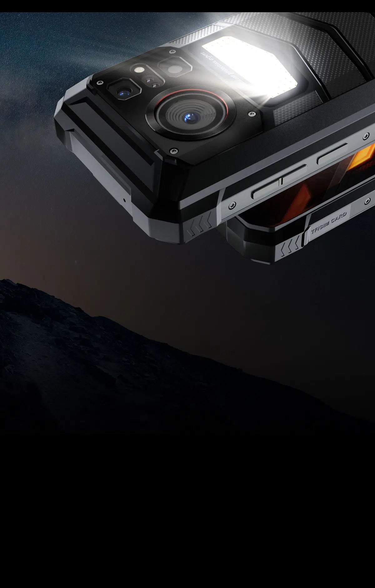 HOTWAV W11 rocks super strong LED camping light on the back with impressive intensity and brightness, offering up to 280 lumens. Its power is sustained by an ultra 20800mAh battery for prolonged usage. With around 510 lighting beads and up to 6 watts of power, this LED light efficiently projects a beam over long distances. Additionally, it's built to endure wet or harsh conditions, boasting high water resistance and rugged durability against rough handling.