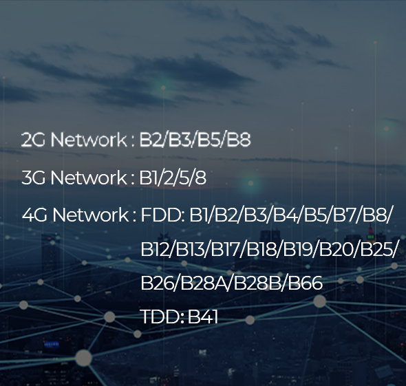 4G: FDD: B1/ B2/B3 /B4/B5 /B7/B8/ B12/B13/B17/B18/B19 /B20 /B25 /B26 /B28A /B28B /B66 TDD: B41