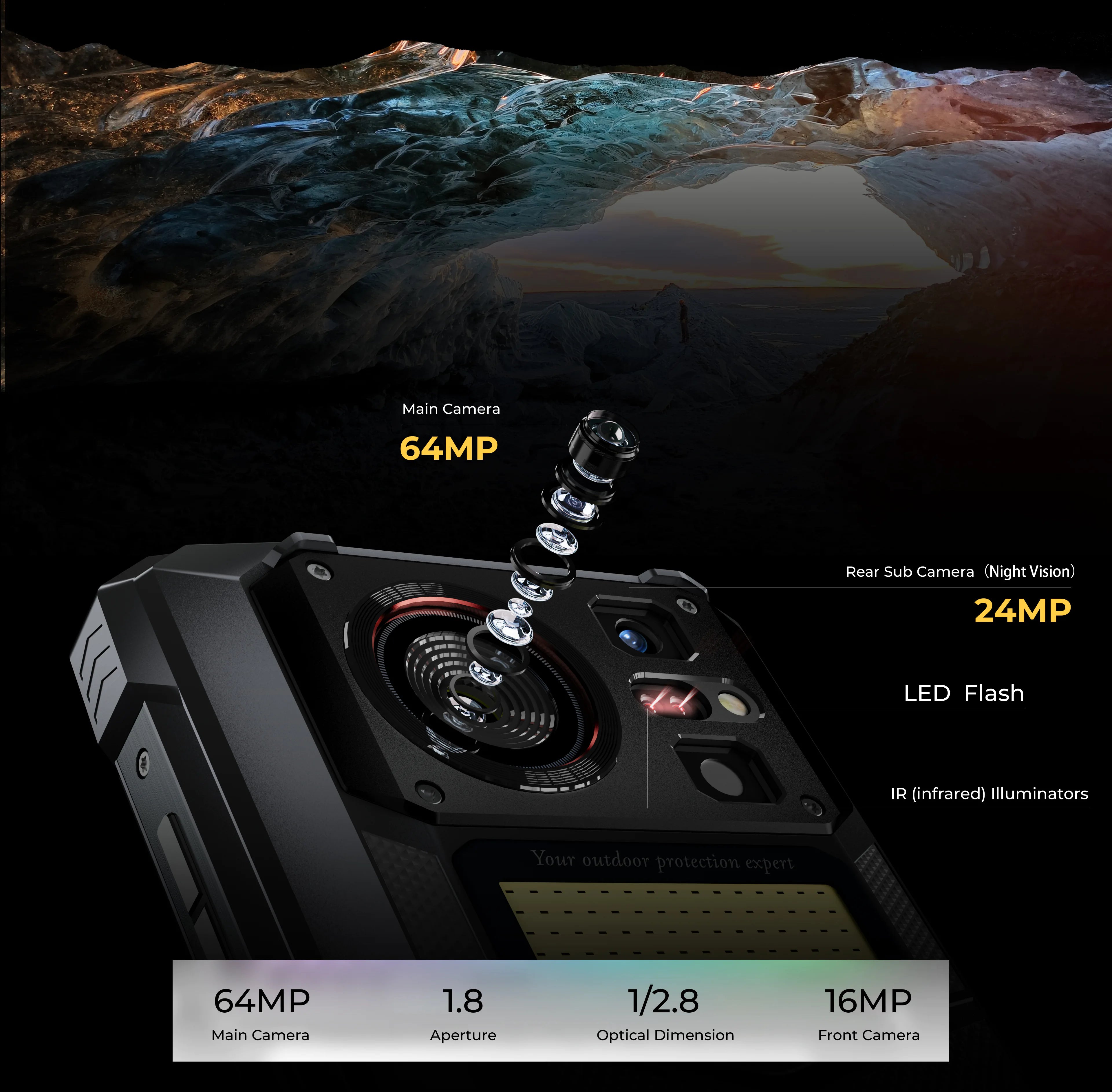 HOTWAV W11 presents a 64MP high-performance Sony lens as the rear main camera to meet your needs of capturing all the beautiful views and wonderful moments on your outdoor journeys with striking clarity and vivid details.